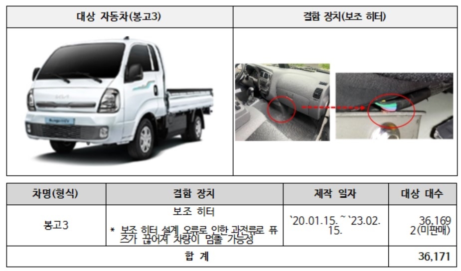 기아 봉고3 3만6천171대는 보조 히터 설계 오류로 오는 27일부터 시정조치를 한다.