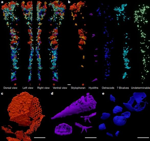 | ▲ 삼엽충 화석 내장에서 확인된 내용물 전체 소화관 내용물 스캔 모델(a)과 등쪽에서 본 소화관 내용물(b). 내장에서 확인된 극피동물과 원뿔형의 히올리스, 조개류 조각(c~e). 기준자 크기는 1㎜(a,b), 500㎛(c-e).[Petr Kraft et al./Nature 제공. 재판매 및 DB 금지] |