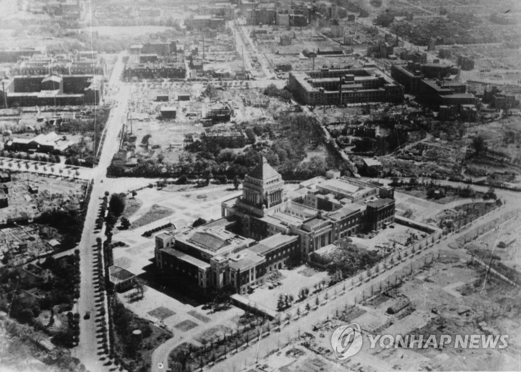 | ▲ 공습으로 폐허가 된 일본 국회의사당 주변 (도쿄 교도=연합뉴스) 2차 대전 중 도쿄대공습으로 폐허가 된 일본 국회의사당(가운데)과 주변의 관공서 거리. 국회의사당도 소이탄의 폭격을 받았으나 형태를 유지하고 있다. 1945년 10월 4일 촬영한 사진. [자료사진] |