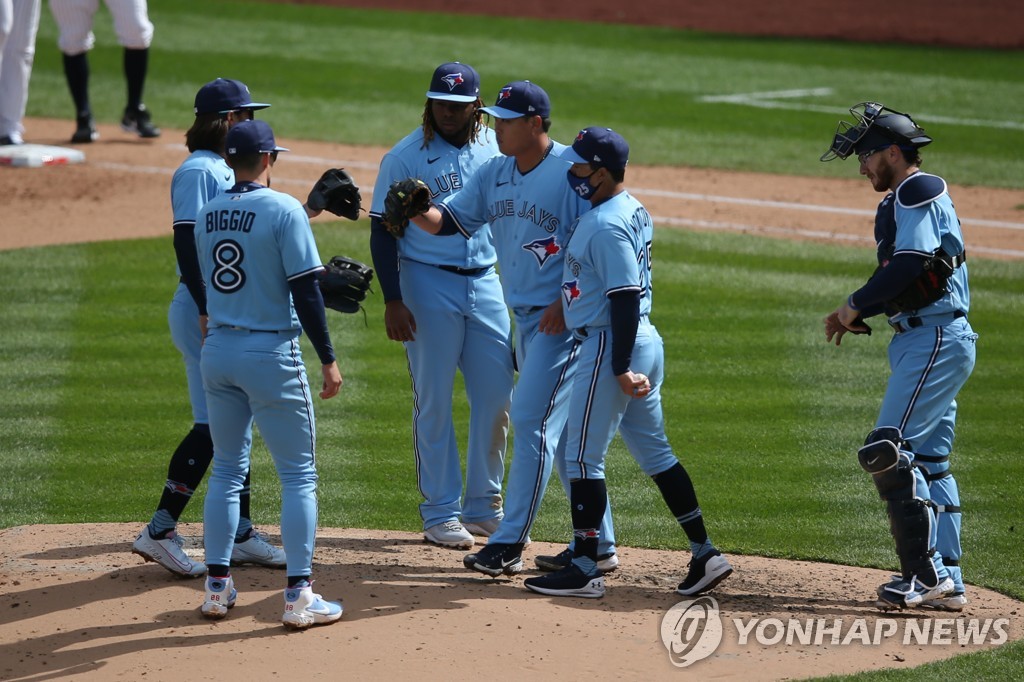 | ▲ 마운드 내려가는 류현진 (뉴욕 USA투데이스포츠/로이터=연합뉴스) 토론토 블루제이스 1선발 류현진(가운데)이 2일(한국시간) 미국 뉴욕주 양키스타디움에서 열린 2021년 미국프로야구 메이저리그 뉴욕 양키스와의 방문 경기에 선발 등판해 역투한 뒤, 6회 1사 후 마운드를 내려가고 있다. |