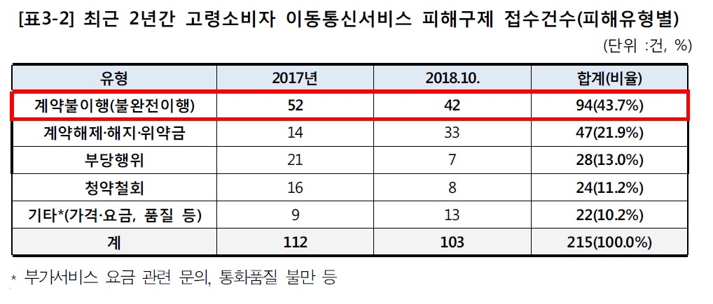 | ▲ 2017~2018년 고령소비자 이동통신서비스 피해유형별 피해구제 접수건수 [한국소비자원 자료 캡처. 재판매 및 DB 금지] |