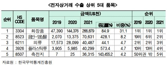 지난해 전체 전자상거래 수출에서 화장품 비중은 31.1%로 압도적 1위였고, 음반·영상물이 8.2%로 그 뒤를 이었다. 의류 비중은 4.7%였다.