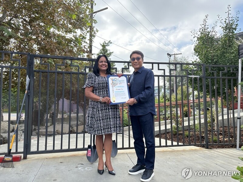 | ▲ 이수만 전 SM엔터테인먼트 총괄 프로듀서(오른쪽)과 홀리 미첼 LA카운티 슈퍼바이저 (로스앤젤레스=연합뉴스) 임미나 특파원 = 이수만 전 SM엔터테인먼트 총괄 프로듀서가 28일(현지시간) 미국 로스앤젤레스(LA)에서 열린 'LA 환경 개선 프로젝트' 출범식에 참석해 홀리 미첼 LA 카운티 슈퍼바이저(행정책임자)와 기념사진을 촬영하고 있다. 이수만은 LA의 한인 비영리단체 KYCC와 함께하는 나무 심기 프로젝트에 최대 50만달러를 기부한다. mina@yna.co.kr |