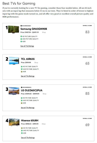 12일 업계에 따르면 최근 컨슈머리포트는 대형 TV로 게임을 즐기는 추세에 따라 TV 제품들을 대상으로 ▲ 입력 지연(input lag) ▲ 화면 주사율 ▲ 화질 ▲ HDMI 2.1 지원 여부 ▲ 최신 콘솔 기기와의 호환성 등 5가지 항목을 테스트한 결과를 발표했다.