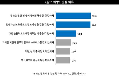 이어 '언젠가는 노화 등으로 탈모를 겪을 것 같아서'(57.7%), '습관적으로 예방'(33.9%) 등 순이었다.