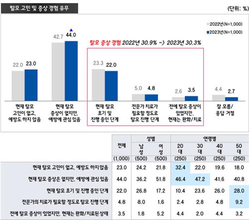 조사 결과 전체 응답자의 30.3%가 '탈모를 경험한 적이 있다'고, 44%가 '탈모 증상은 없지만 탈모 예방에 관심이 많다'고 각각 답했다.