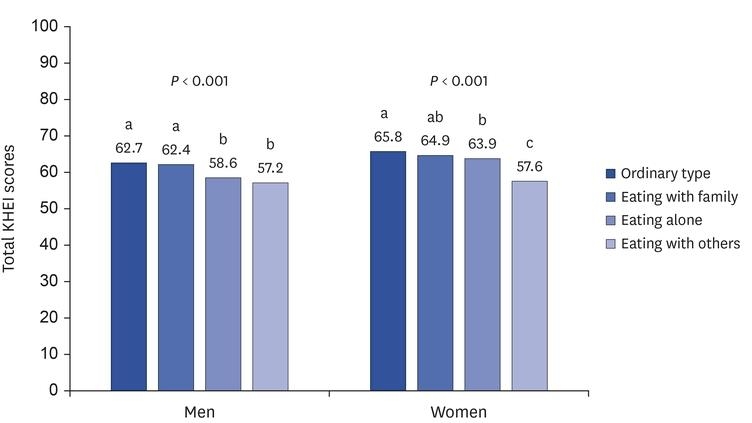 8일 논문에 따르면 연구팀은 국민건강영양조사(2013~2015)에 참여한 19세 이상 성인 1만5천74명(남 6천180명, 여 8천894명)을 대상으로 평상시 식사 유형에 따른 '식생활평가지수'(KHEI)를 산출해 비교 분석했다. 식사 유형은 집밥과 외식 등이 섞인 일반 그룹(60.2%), 항상 가족과 함께 식사하는 집밥 그룹(21.9%), 주로 혼자서 식사하는 혼밥 그룹(12.9%), 주로 가족 이외 타인과 식사하는 그룹(5.6%) 4가지였다.
