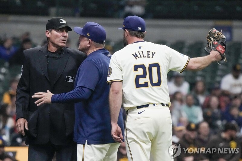| ▲ 밀워키 마일리와 설전 벌이는 에르난데스 심판 [AP=연합뉴스 자료사진] |