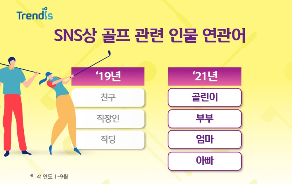 2019년 1~9월에는 '친구', '직장인', '직딩'(직장인을 이르는 말)이 골프 관련 인물 연관어로 가장 많았는데 올해 1~9월에는 '골린이', '부부', '엄마', '아빠'가 최다였다.