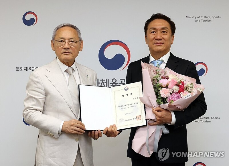 | ▲ 유인촌 장관, 국제방송교류재단 사장 임명장 수여 (서울=연합뉴스) 유인촌 문화체육관광부 장관이 5일 서울 종로구 국립현대미술관 서울관에서 김태정 국제방송교류재단 사장에게 임명장을 수여한 후 기념 촬영하고 있다. 2024.6.5 [문화체육관광부 제공. 재판매 및 DB 금지] photo@yna.co.kr |