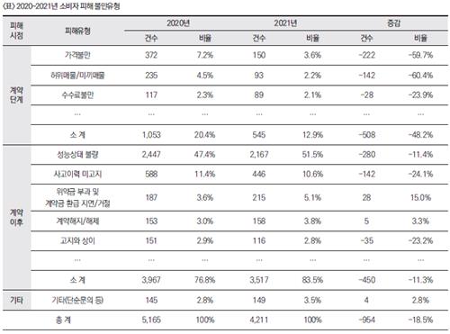 소비자연맹이 소비자불만을 유형별로 분석한 결과 '사고이력 미고지'가 1천34건(11%,) '위약금 부과 및 계약금 환급 지연·거절' 402건(4.3%), '계약해지·해제' 311건(3.3%), '고지 내용과 상이함' 267건(2.8%) 순이었다.