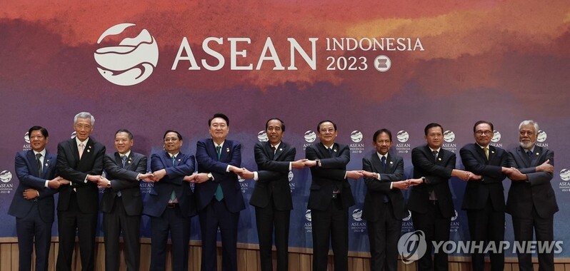 | ▲ South Korean President Yoon Suk Yeol (5th from L) joins a group photo session during a summit with the leaders of the 10-member Association of Southeast Asian Nations in Jakarta on Sept. 6, 2023. (Yonhap) |