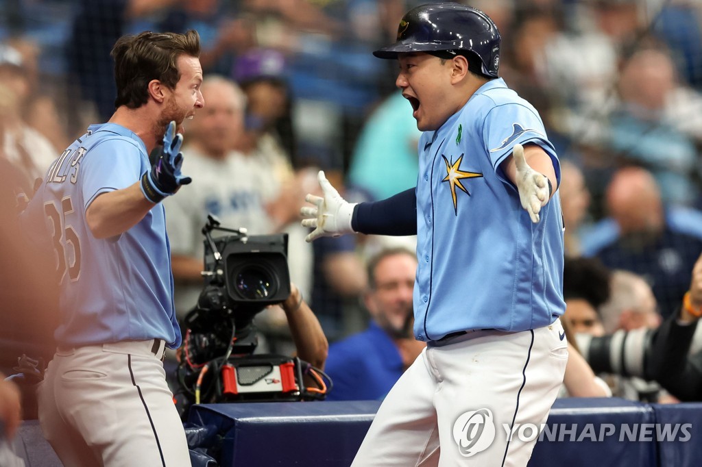 | ▲ 기뻐하는 최지만 탬파베이 레이스 최지만(오른쪽)이 30일(한국시간) 미국 플로리다주 세인트피터즈버그 트로피카나 필드에서 열린 2022 미국프로야구 메이저리그(MLB) 뉴욕 양키스와 홈 경기 0-1로 뒤진 2회 동점 솔로홈런을 날린 뒤 더그아웃으로 들어가면서 기쁨의 세리머니를 펼치고 있다. [AFP=연합뉴스] |