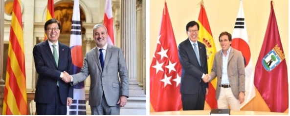 | ▲ 박형준 시장, 스페인 방문 부산-바르셀로나 자매도시 행사(왼쪽)와 마드리드 시장 면담 [부산시 제공] |