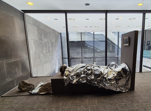 (서울=연합뉴스) 황희경 기자 = 서울 서초동에 있는 페리지갤러리의 전시장. 두 공간으로 나뉜 전시장 중 한 곳에는 관객이 누울 수 있는 공간이 마련돼 있다. 가상현실(VR) 장치를 쓴 관람객이 따뜻하게 데워진 돌을 쥐고 누우면 응급 구조용 은박지가 덮인다. 관람객의 머리맡에는 쑥이 타들어 간다.