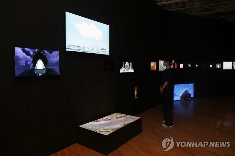 | ▲ 비판적 시각 연구자 호추니엔 전시 개최 (서울=연합뉴스) 강민지 기자 = 3일 오후 서울 종로구 아트선재센터에서 열린 '호추니엔: 시간과 클라우드' 기자간담회에서 참석자가 전시를 둘러보고 있다. 전시는 다양한 매체를 통해 아시아 근대성, 역사, 정체성을 탐구한 호추니엔의 작업을 선보인다. 2024.6.3 mjkang@yna.co.kr |