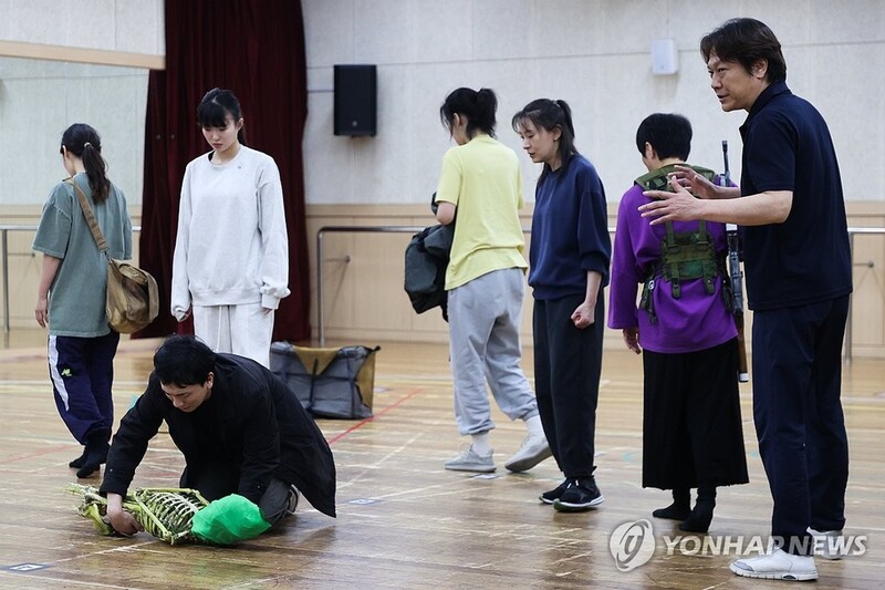 | ▲ 전쟁 끝에 마주한 가족애, 연극 '연안지대' (서울=연합뉴스) 류효림 기자 = 28일 서울 종로구 세종문화회관에서 열린 서울시극단 연극 '연안지대' 연습실 공개 행사에서 단원들이 주요 장면을 시연하고 있다. 2024.5.28 ryousanta@yna.co.kr |