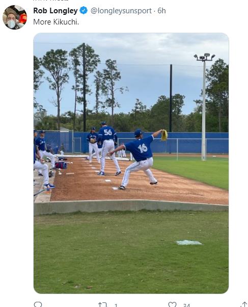 | ▲ 불펜피칭하는 기쿠치(등번호 16) [토론토선 롭 롱니 기자 트위터 캡처. 재판매 및 DB금지] |