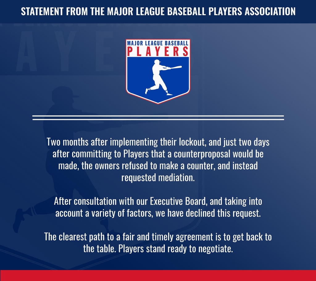 선수노조는 5일(한국시간) "구단이 노조에 '새로운 제안을 하겠다'고 약속한 지 이틀 만에 태도를 바꿔 노조와의 협상을 거부하고 연방중재조정기구의 중재를 요청하는 메시지를 냈다"며 "선수노조 이사회는 구단의 요청을 거부하기로 했다. 공정한 합의를 이루는 가장 확실한 방법은 노사가 협상 테이블에서 만나는 것이다. 제3자의 개입은 반대한다"고 성명서를 냈다.