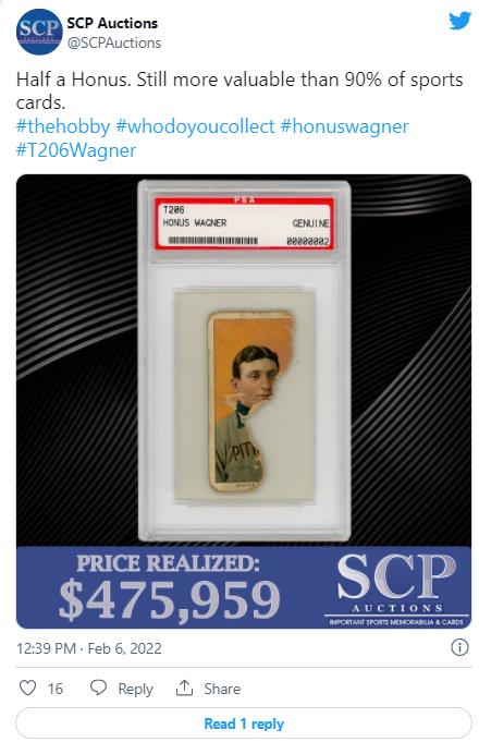 | ▲ 호너스 와그너의 절반 찢어진 야구 카드가 47만달러에 낙찰됐다. [SCP옥션 트위터 캡처. 재판매 및 DB금지] |