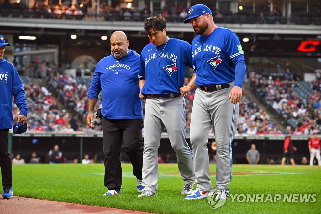 | ▲ 클리블랜드전에서 타구에 맞고 마운드를 내려가는 류현진 [AFP/게티이미지=연합뉴스] |