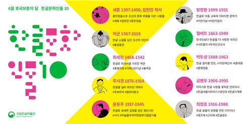 선정된 인물은 ▲ 세종과 집현전 학사 ▲ 허균 ▲ 최세진 ▲ 주시경 ▲ 윤동주 ▲ 방정환 ▲ 호머 헐버트 ▲ 박두성 ▲ 공병우 ▲ 최정호 등이다.
