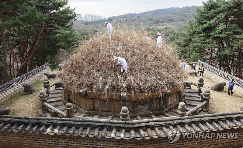 | ▲ 한식 맞아 건원릉 억새 베기 (구리=연합뉴스) 김주형 기자 = 한식인 5일 경기도 구리시에 있는 동구릉 내 태조 이성계의 무덤인 건원릉에서 봉분을 덮고 있는 억새를 자르는 '청완 예초의'가 치러지고 있다. 2024.4.5 kjhpress@yna.co.kr |