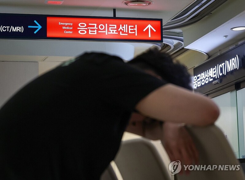 ▲ A visitor at a hospital in Seoul takes a rest with his face down on June 6, 2024, amid the prolonged doctors' strike. Doctors at Seoul National University Hospital held a vote this day on whether to go on a strike in protest of the government's medical reform plan. (Yonhap)