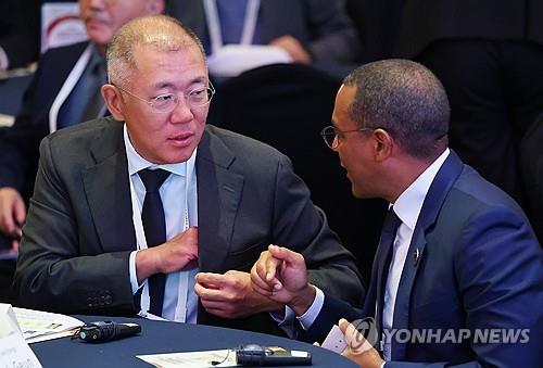 ▲ Hyundai Motor Group Chair Euisun Chung (L) speaks with an African official during the 2024 Korea-Africa Business Summit at Lotte Hotel in Seoul on June 5, 2024. (Yonhap)