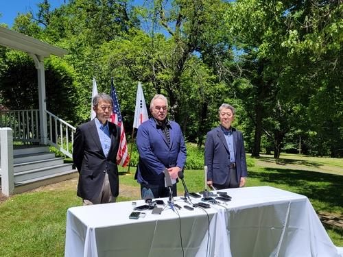 ▲ U.S. Deputy Secretary of State Kurt Campbell (C) speaks to the press before a trilateral meeting with South Korea's Vice Foreign Minister Kim Hong-kyun (R) and Japanese Vice Foreign Minister Masataka Okano at Iron Bell Farm in Virginia on May 31, 2024. (Pool photo) (Yonhap)
