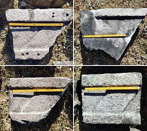 | ▲ 경주읍성 석물마당에 있는 신라 계단 난간 받침돌 추정 석재 박홍국 교수는 위에서 왼쪽을 A유형, 오른쪽을 B유형이라고 명명했다. 아래 왼쪽은 C유형, 오른쪽은 D유형이다. A유형에는 구멍이 선명하게 보인다. [박홍국 교수 제공. 재판매 및 DB 금지] |