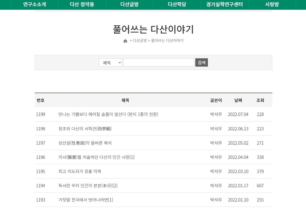 | ▲ 풀어쓰는 다산 이야기 [다산연구소 홈페이지 캡처. 재판매 및 DB 금지] |