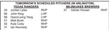 | ▲ 양현종의 30일 등판을 알리는 텍사스 게임노트 [텍사스 레인저스 게임노트 캡처. 재판매 및 DB금지] |