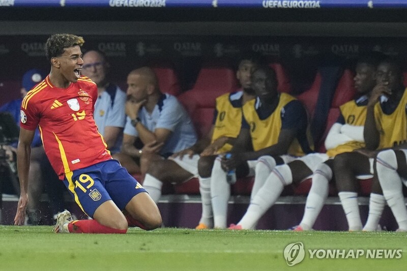 프랑스 골키퍼 마이크 메냥이 방향을 읽고 몸을 날렸으나, 골대 왼쪽 상단 구석을 찌르는 야말의 정교한 슈팅을 막기엔 역부족이었다.