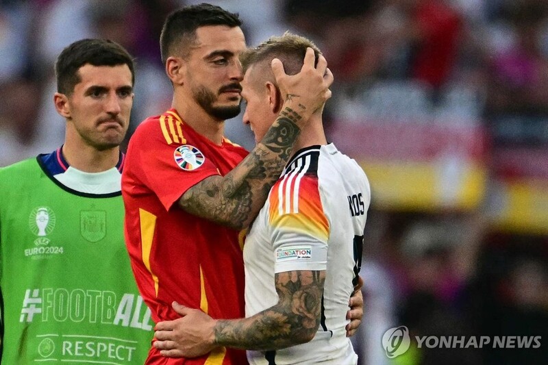| ▲ 독일의 유로 2024 탈락이 확정된 뒤 스페인 선수의 위로를 받는 토니 크로스 [AP=연합뉴스] |