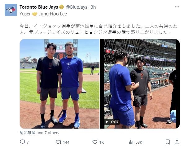 토론토 구단은 엑스에 "이정후와 기쿠치가 인사를 나눴다. 둘이 함께 아는 전 토론토 투수 류현진에 관해 이야기하며 즐거운 시간을 보냈다"고 썼다.