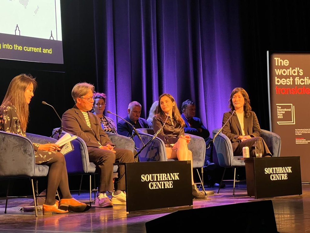 ▲ 영국 부커상 낭독회 (런던=연합뉴스) 최윤정 특파원 = 18일(현지시간) '고래'의 천명관 작가(왼쪽 두 번째)와 김지영 번역가(오른쪽)가 영국 런던 사우스뱅크 센터에서 개최된 부커상 인터내셔널 부문 후보작 낭독회에서 사회자와 문답을 나누고 있다. 2023.5.19 merciel@yna.co.kr