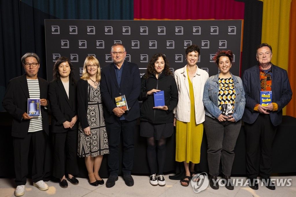 ▲ 부커상 인터내셔널 부문 후보 작가와 번역가들 (런던=연합뉴스) 18일(현지시간) 영국 런던 사우스뱅크센터에서 개최된 부커상 인터내셔널 부문 후보 낭독회에서 '고래'의 천명관 작가(오른쪽)를 비롯한 부커상 인터내셔널 부문 후보 작가와 번역가들이 기념 촬영하고 있다. 2023.5.19 [부커 제공. 재판매 및 DB 금지] photo@yna.co.kr