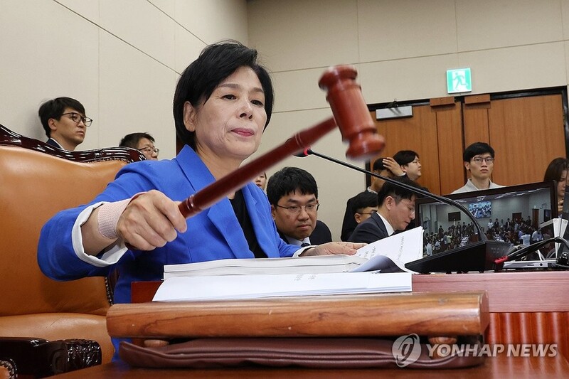 | ▲ 의사봉 두드리는 최민희 위원장 7월 16일 오후 국회에서 이진숙 방통위원장 후보자 인사청문회 실시계획서 채택, 방송법 개정안 등을 상정하는 국회 과학기술정보방송통신위원회 전체회의가 열리고 있다. 더불어민주당 소속 최민희 위원장이 의사봉을 두드리고 있다. [연합뉴스 자료사진] |