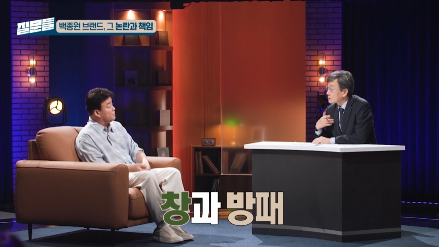 백 대표가 가맹점주들과 갈등을 벌이고 있는 민감한 상황인데도 손 전 사장은 점주들의 입장에서 거듭해서 날카로운 질문을 던졌고, 백 대표도 자신의 입장을 적극적으로 밝히면서 분위기가 금방 달아올랐다. 논쟁이 뜨거워지자 화면에 '창과 방패'라는 자막이 등장했다.
