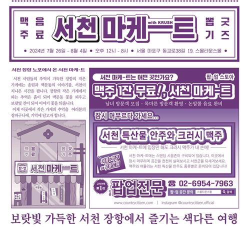 (서천=연합뉴스) 정윤덕 기자 = 충남 서천군은 롯데칠성음료와 손잡고 오는 26일부터 서울 연남동에 '보랏빛 가득한 서천 장항에서 즐기는 색다른 여행'이라는 주제로 반짝매장(팝업스토어)을 연다고 25일 밝혔다.