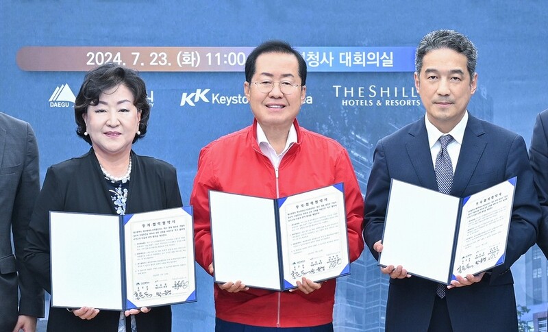 대구시는 23일 시청 산격청사에서 케이케이㈜, ㈜호텔신라와 '프리미엄급 호텔 건립 투자·협력 협약(MOU)'을 했다.