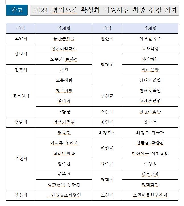 (수원=연합뉴스) 김경태 기자 = 경기도와 경기관광공사는 '2024 경기노포 선정 및 활성화 지원 사업' 공모를 통해 경기노포 32곳을 14일 추가 선정했다.