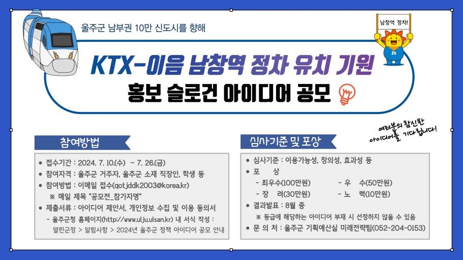 (울산=연합뉴스) 허광무 기자 = 울산시 울주군은 KTX-이음 남창역 정차를 기원하는 홍보 슬로건을 선정하고자 정책 아이디어 공모를 진행한다고 10일 밝혔다.