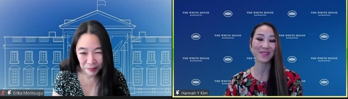 | ▲ Erika Moritsugu (L), deputy assistant to the president and Asia-Americans, Native Hawaiians and Pacific Islanders (AANHPI) senior liaison at the White House, and Hannah Kim, AANHPI policy advisor at White House Office of the Chief of Staff, are seen holding a special virtual briefing on Jan. 12, 2023 on the eve of Korean American Day in this captured image. (Yonhap) |