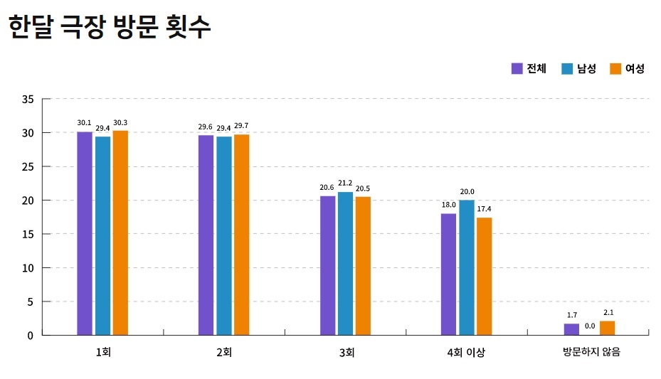 한 달에 한 번 극장에 간다는 응답은 30.1%였다. 한 번도 극장을 찾지 않는 경우는 1.7%에 그쳤다.
