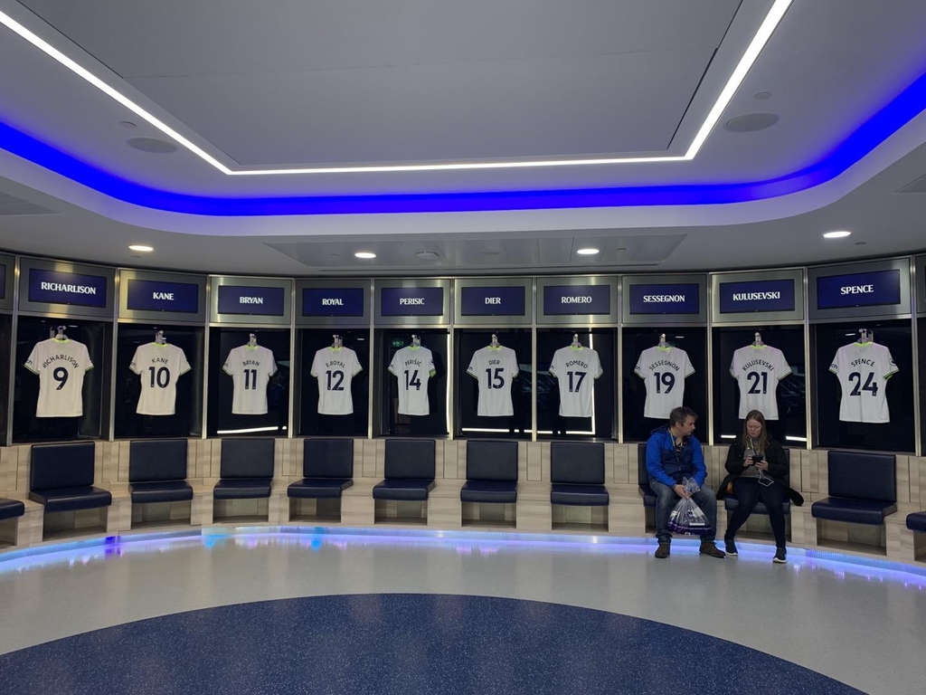 스타디움 투어 코스를 따라 선수 대기실에 들어가니 유니폼이 번호순서대로 걸려있었다. 하틀리씨는 "실제 경기 때는 해리 케인이 코치를 마주보는 한가운데 15번 자리에 앉고 그 옆이 손흥민"이라고 말했다.