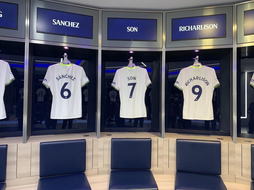 | ▲ 토트넘 홋스퍼 손흥민 유니폼 (런던=연합뉴스) 최윤정 특파원 = 4일(현지시간) 영국 런던 토트넘 홋스퍼 스타디움의 선수 대기실에 손흥민 선수의 유니폼이 걸려있다. 2022.11.13 merciel@yna.co.kr |