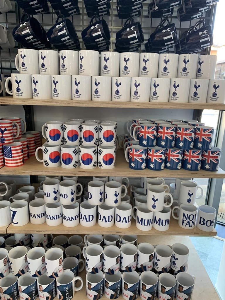 유니폼 외에도 매장 곳곳에 보이는 태극기가 새겨진 머그컵, 작은 태극기가 달린 모자, 태극기 핀, 손흥민 얼굴이 새겨진 목도리 등에서 손흥민의 영향력을 가늠할 수 있었다.