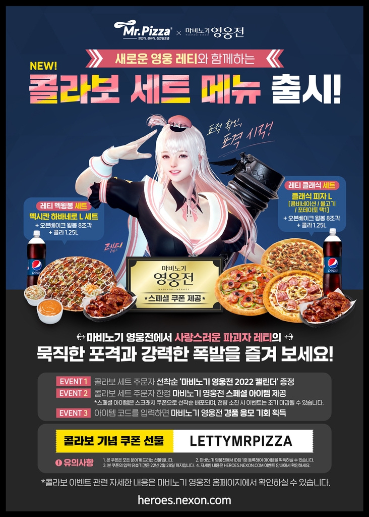▲ 미스터피자는 RPG게임 '마비노기 영웅전'과 협업해 이 게임 신규 캐릭터인 '레티'의 출시를 기념하는 세트 메뉴를 내놓았다. 신메뉴를 주문할 경우 마비노기 영웅전에서 쓸 수 있는 게임 아이템 쿠폰을 선착순으로 증정한다.